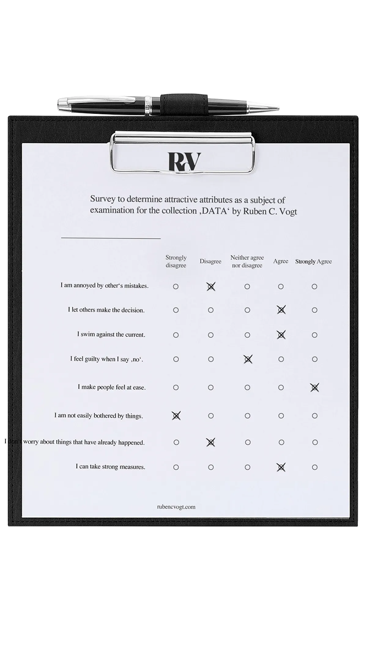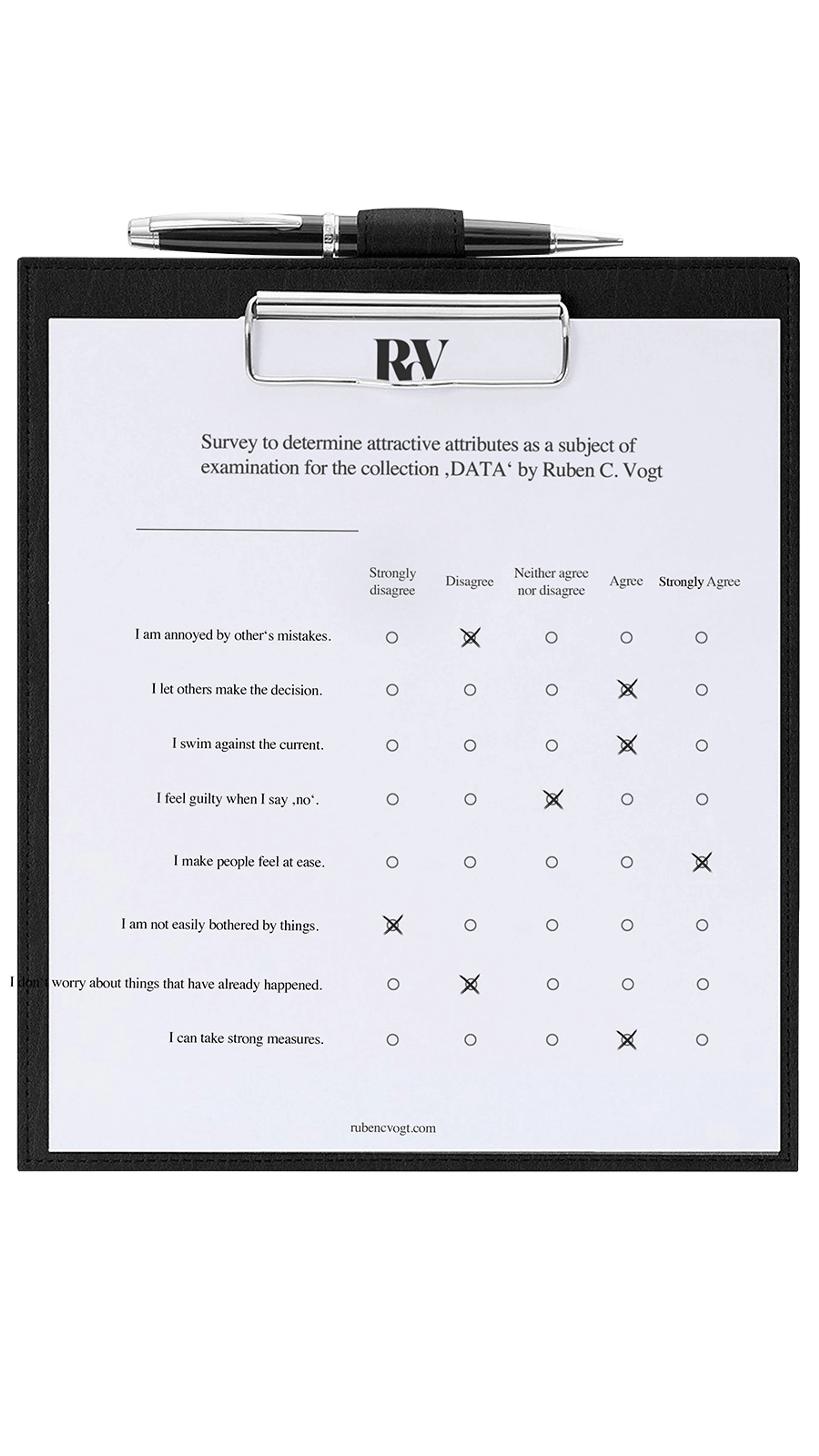 In collaboration with Olivia Kalinowski, PhD student at the Charité Psychiatric University Clinic at St. Hedwig Hospital, the designer conceptualised a study for the DATA collection that puts a subjectively chosen group of people from his surrounding through a qualitative study based on the concept of grounded theory.